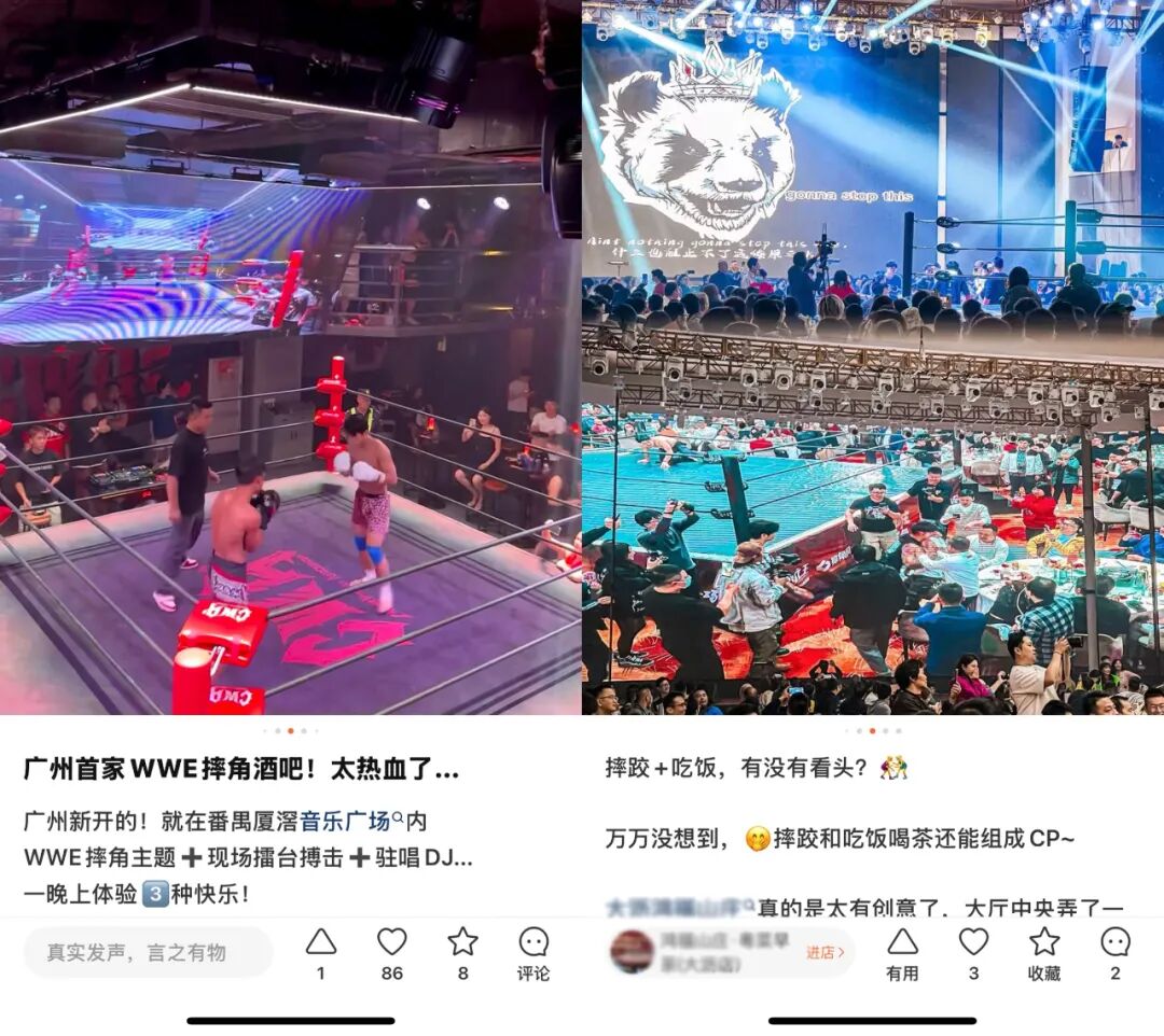 以广东部分酒楼为例,其在大厅中央搭建的摔跤擂台已成为引流利器。“演员们真的很敬业,动的都是‘真功夫’,一晚上好几场表演,看得非常过瘾!”一位食客在大众点评上这样写道。这种基于本地的传统武术文化氛围,将表演与早茶相结合的方式,不仅没有削弱餐饮的本质,反而通过增强表演的真实性与仪式感,让用餐体验更加丰富多元。
