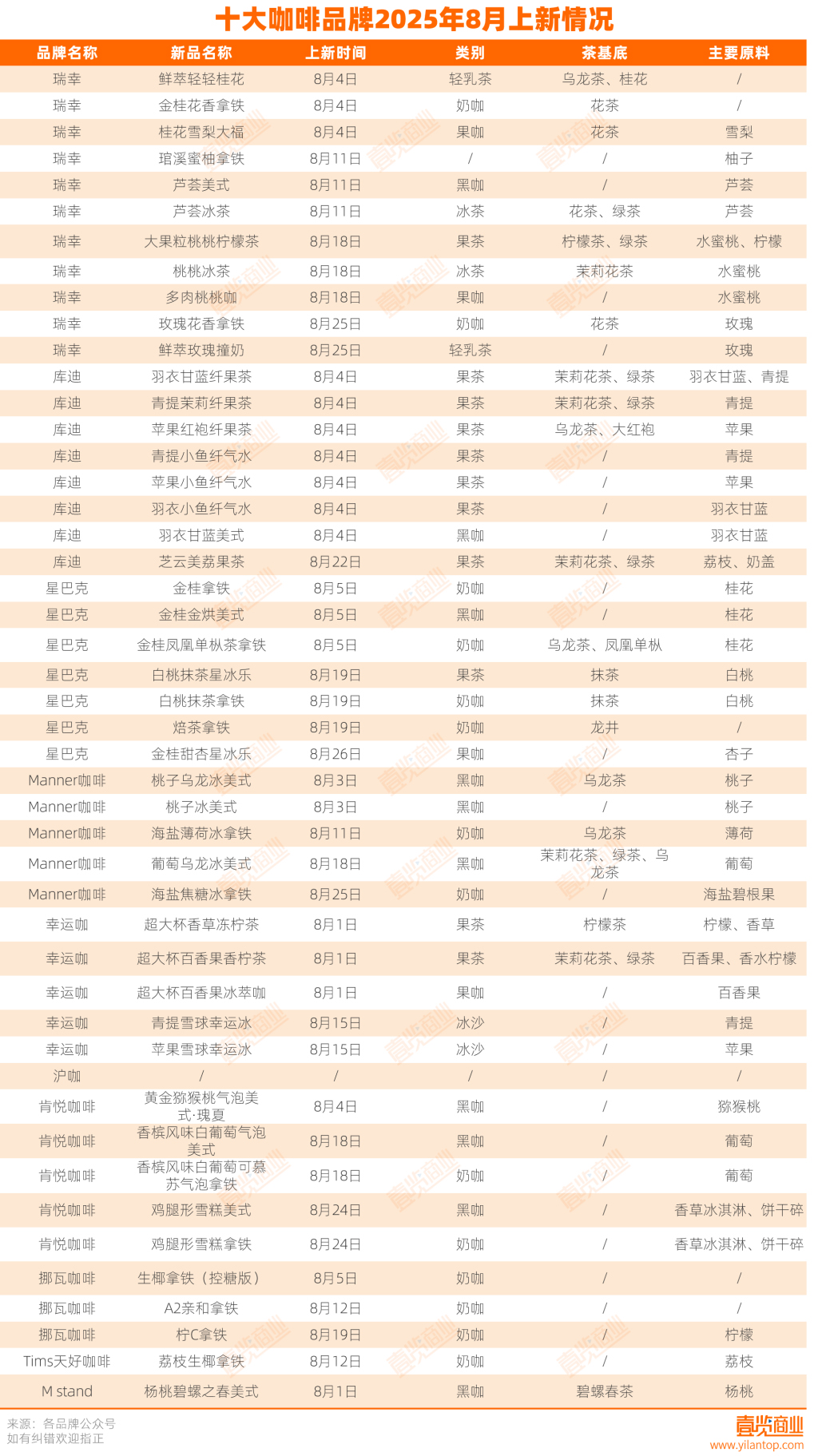 总体而言,8月的咖啡新品延续了夏季的高频上新节奏,同时又逐步显露出秋季的风味转向。无论是以花果点缀的奶咖,还是紧跟茶饮趋势的果茶、果咖,品牌们都在用更精细的原料选择和更密集的节奏争夺消费者心智。茶基底的复配和小众化,让产品层次更加立体;水果原料的应季性与节日化应用,则进一步强化了情绪价值和社交传播力。