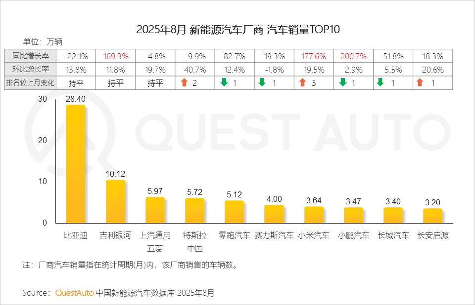 1、8月厂商销量前十中,比亚迪以销量28.40万辆领跑,特斯拉重回销量前五,长安启源重返前十;增幅方面,吉利银河、小米汽车、小鹏汽车销量同比增幅均超150%