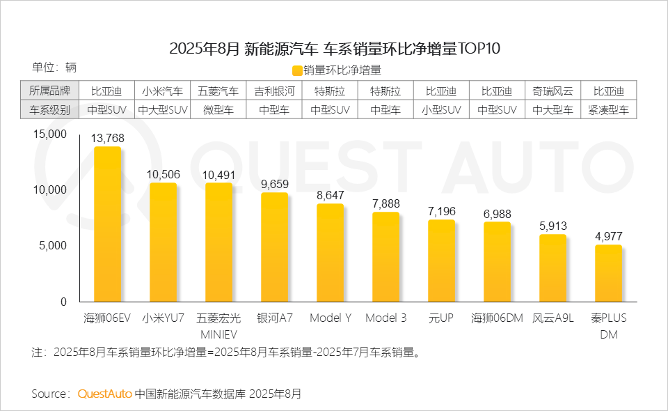 1、8月销量环比净增量TOP10车系中,比亚迪表现突出,旗下四款车型跻身销量环比增幅前十,其中海狮06EV以近1.4万辆的净增销量领跑,近期新车银河A7、风云A9L净增量均超5000辆