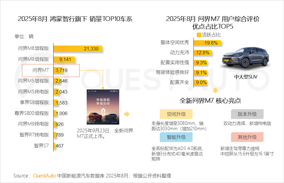 3、9月全新问界M7上市,新车在空间、智能配置、动力等方面实现全方位升级,并首次推出纯电版,增强其在30万级别SUV市场中的竞争力,进一步激发用户购买热情