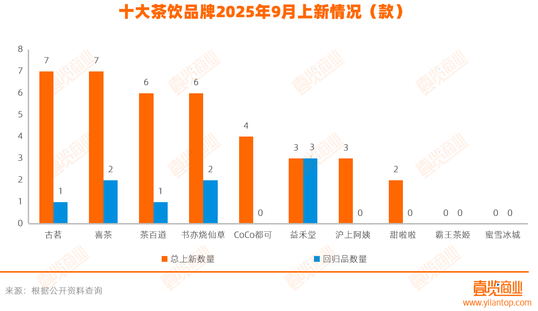 茶饮品牌中,古茗和喜茶在9月并列上新数量榜首,各自推出7款新品;茶百道和书亦烧仙草紧随其后,均上新6款。整体来看,主流茶饮品牌在秋季仍保持较密集的产品更新节奏。
