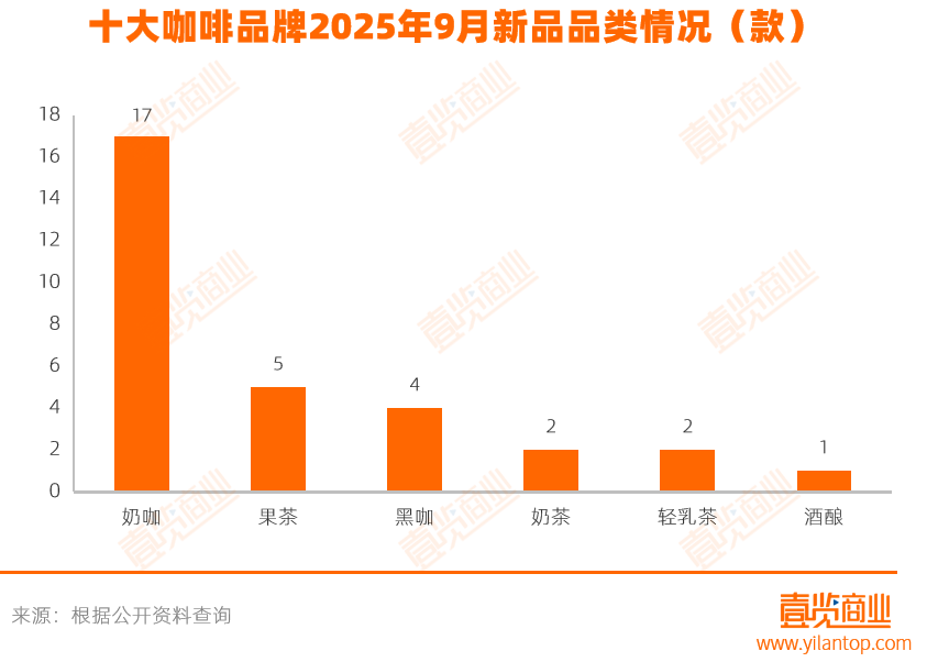 咖啡新品同样呈现出厚重化倾向,奶咖类产品成为推新重点。9月,咖啡品牌共推出17款奶咖新品,占当月咖啡新品总量的54.8%,同期果咖与黑咖的新品数量分别为5款和4款。