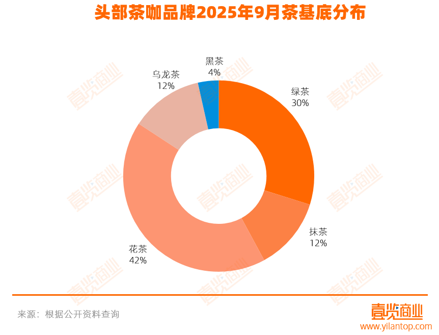 9月,茶咖品牌们选用了5款茶底,其中,使用最多的仍为花茶,其次是绿茶,使用最少的是黑茶。
