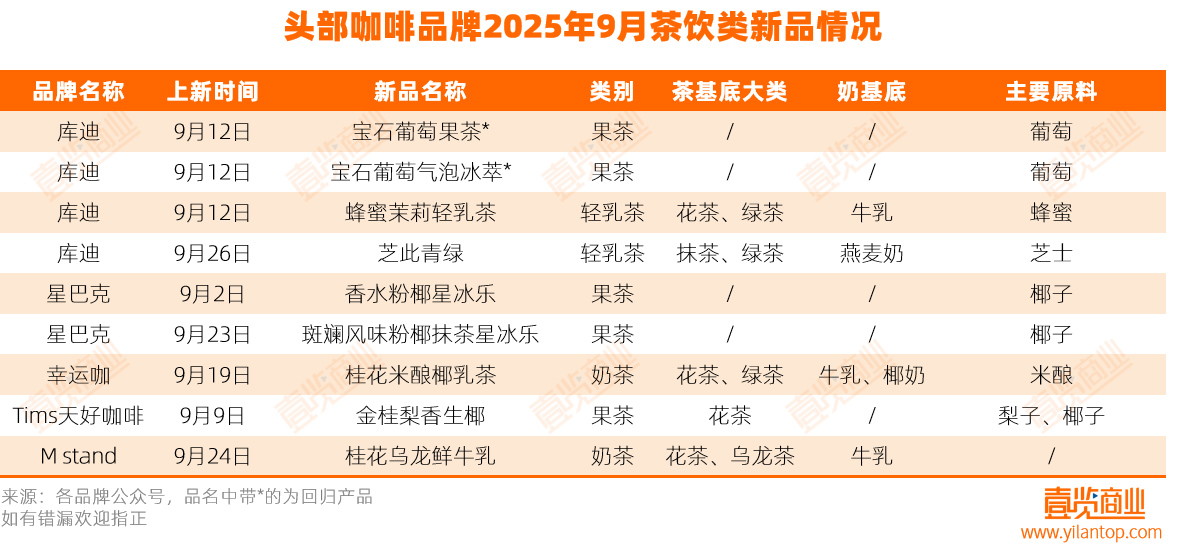 值得一提的是,咖啡品牌也在加速布局茶饮领域。据茶咖观察统计,9月,门店数量排名前十的咖啡品牌共上新9款茶饮类产品,其中库迪推出4款,占其9月新品总数的80.0%;星巴克上新2款星冰乐;幸运咖、Tims天好咖啡与M stand各推出1款茶饮新品。