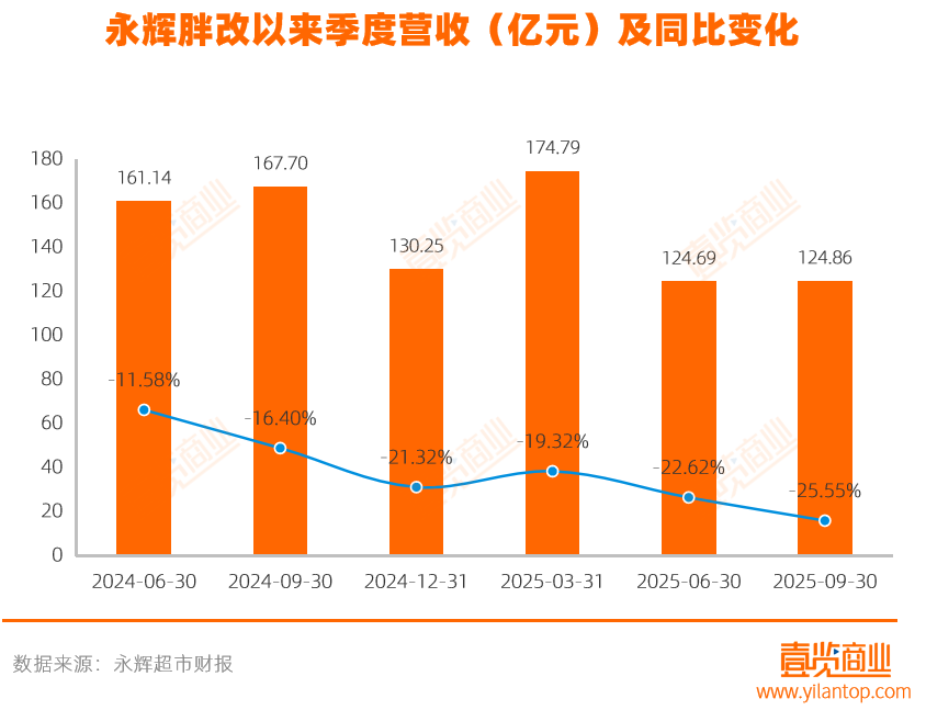 线上营收加速下滑。2025年第三季度永辉的线上业务营业收入22.9亿元,同比下滑38.61%,自2024年第一季度以来,单季度线上业务收入持续收缩,且连续六个季度降幅扩大。这表明永辉在线上获客、用户体验、履约效率等方面存在明显短板。