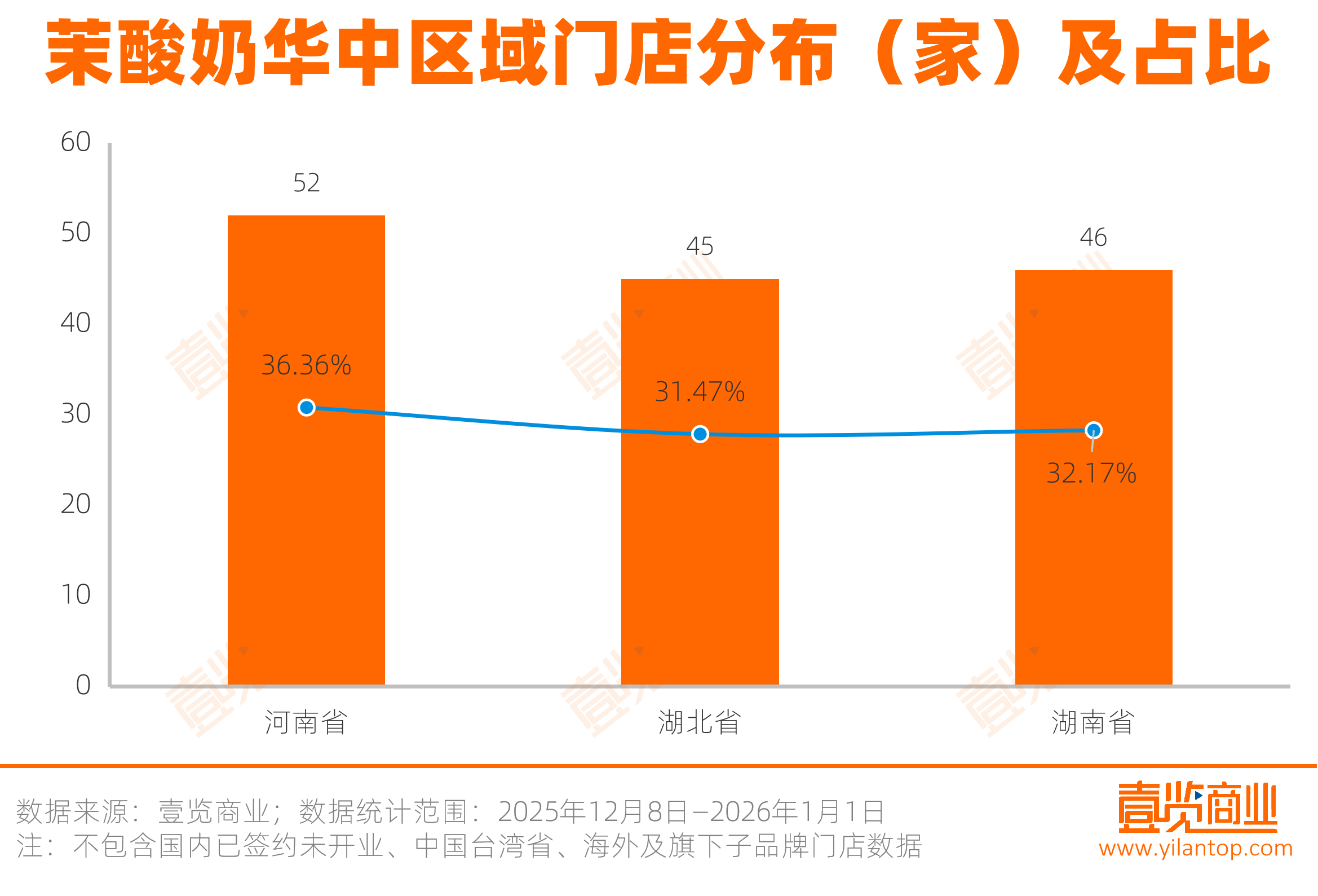 在华中区域,茉酸奶的门店分布呈现出三足鼎立的格局,河南、湖北、湖南占比均在30%上下。