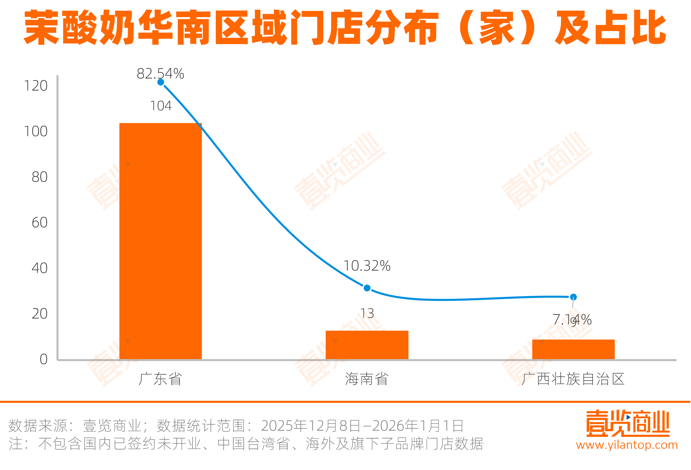 在华南区域,茉酸奶门店则极度依赖广东省,海南省和广西壮族自治区门店数合计不到广东省门店数的四分之一。