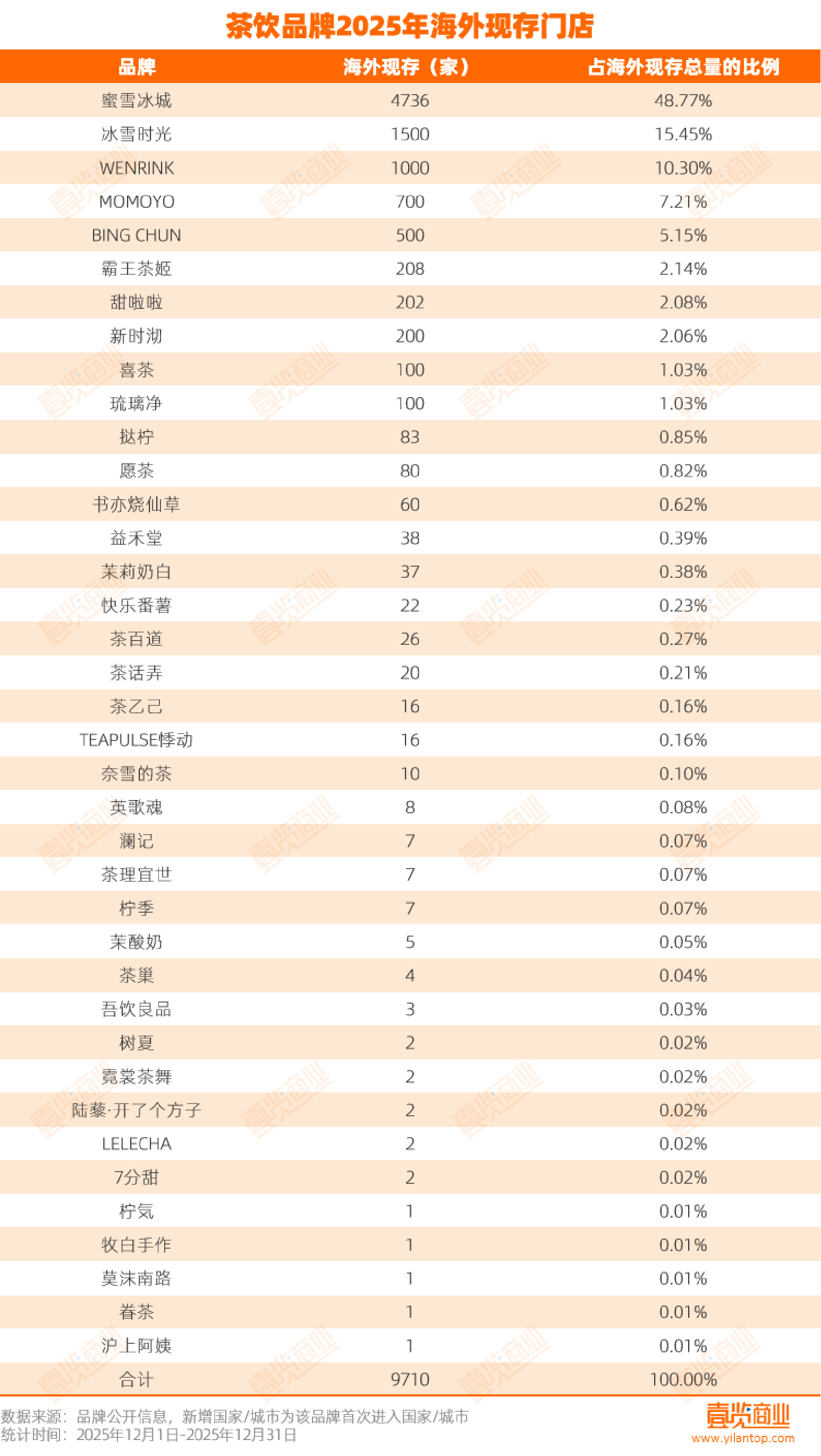 从门店存量看看,截至2025年12月30日,据茶咖观察统计,至少有38个品牌在海外开设了9710家门店。