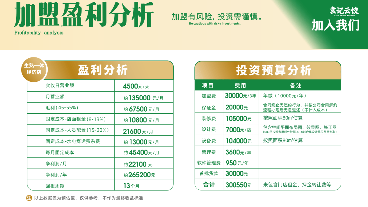 以2025年前9个月的数据估算,开设一家80平米的生熟一体经济店型的袁记云饺,最快13个月回本。值得一提的是,袁记食品提供给加盟商的原材料并不包括蔬菜,若加上蔬菜成本,回本周期会相对更长。