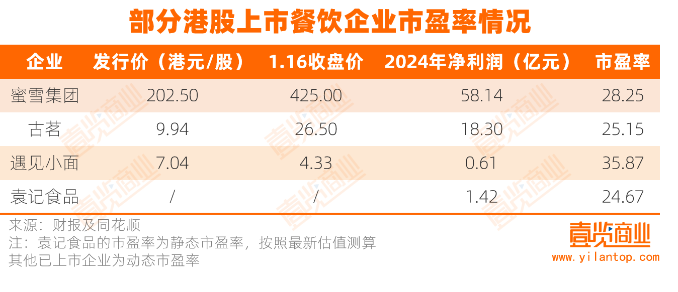 按照最新一轮估值以及2024年的净利润计算,袁记食品的静态PE达24倍,而已上市的、股价表现较好的餐饮企业市盈率在25——30之间,侧面证明其估值的合理性。