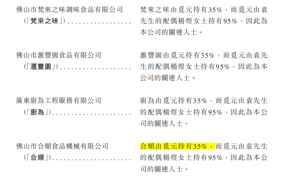 关联交易中,佛山梵来之味、佛山汇丰园、广东厨为、佛山合顺、深圳市左右色彩、深圳特别正经这6家“受到到执行董事近亲属影响”的企业,均与广东觅元企业管理有限公司(下称觅元)有关联。