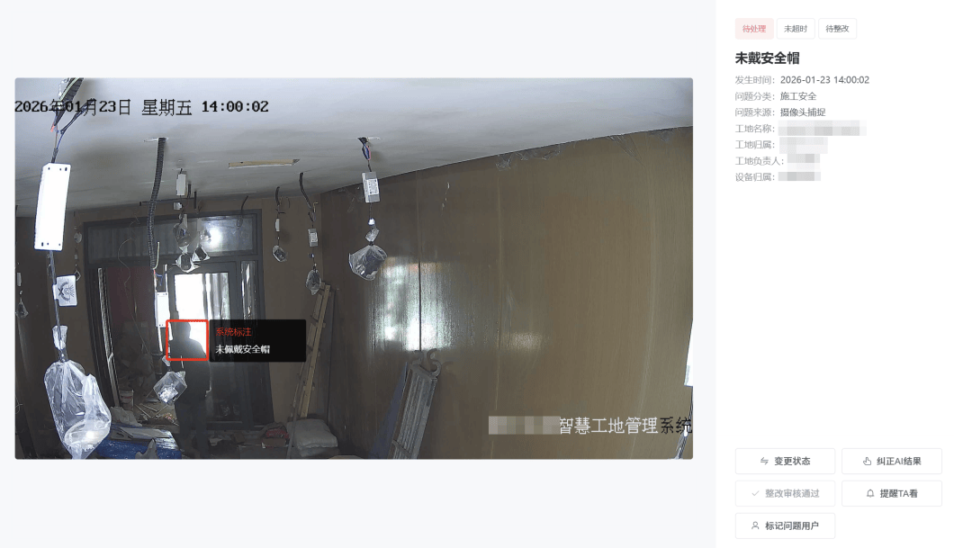 三是安全预警实时化。AI能够7×24小时自动识别未佩戴安全帽、穿拖鞋施工、违规动火作业、现场吸烟、用电不规范等危险行为,并即时推送告警至相关负责人。“相当于放了一个哨兵在那里,他会自己看,自己判断,自己预警。”喻坤说。