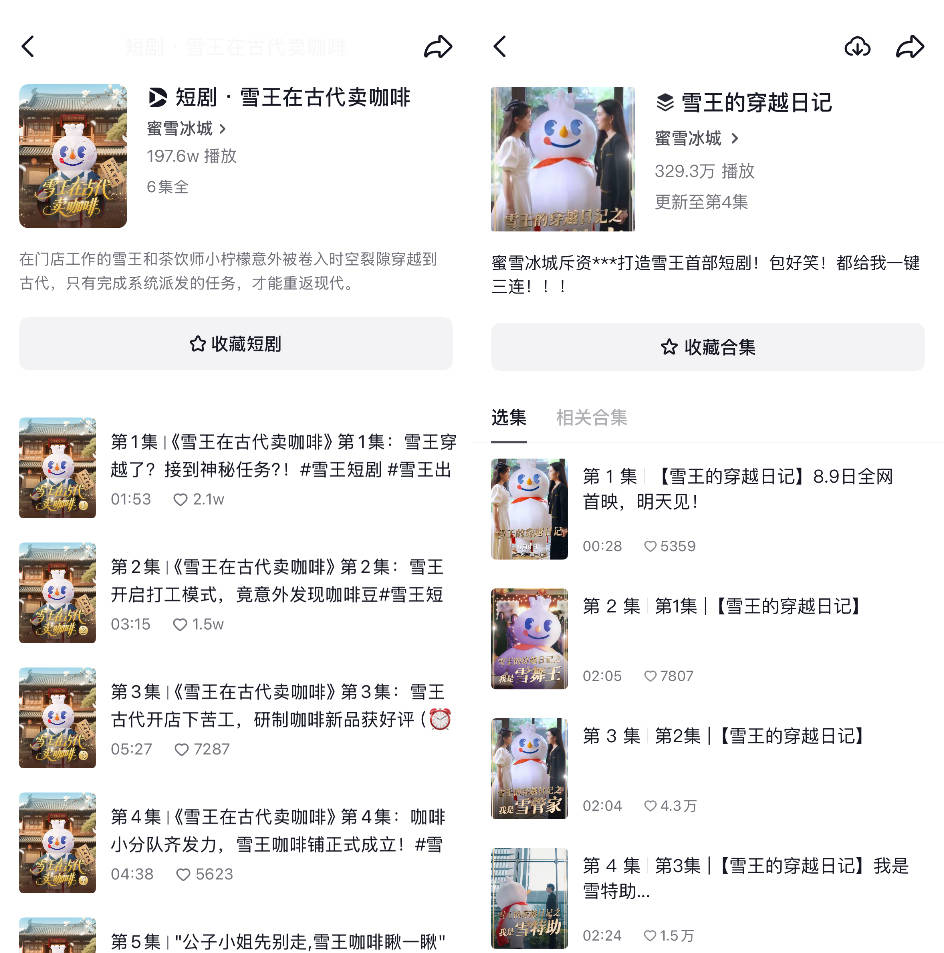 一方面,蜜雪冰城持续完善内容矩阵建设。蜜雪冰城于2023年推出了原创动漫《雪王驾到》,为动漫界带来了“奶茶番”,开播首周在B站收获9.9的高分,全网播放量超过2亿次;2024年又上线了《雪王之奇幻沙洲》。除了动漫,雪王还亲自上阵演起了短剧,自制短剧《雪王在古代卖咖啡》《雪王的穿越日记》,抖音浏览量合计突破五百万。
