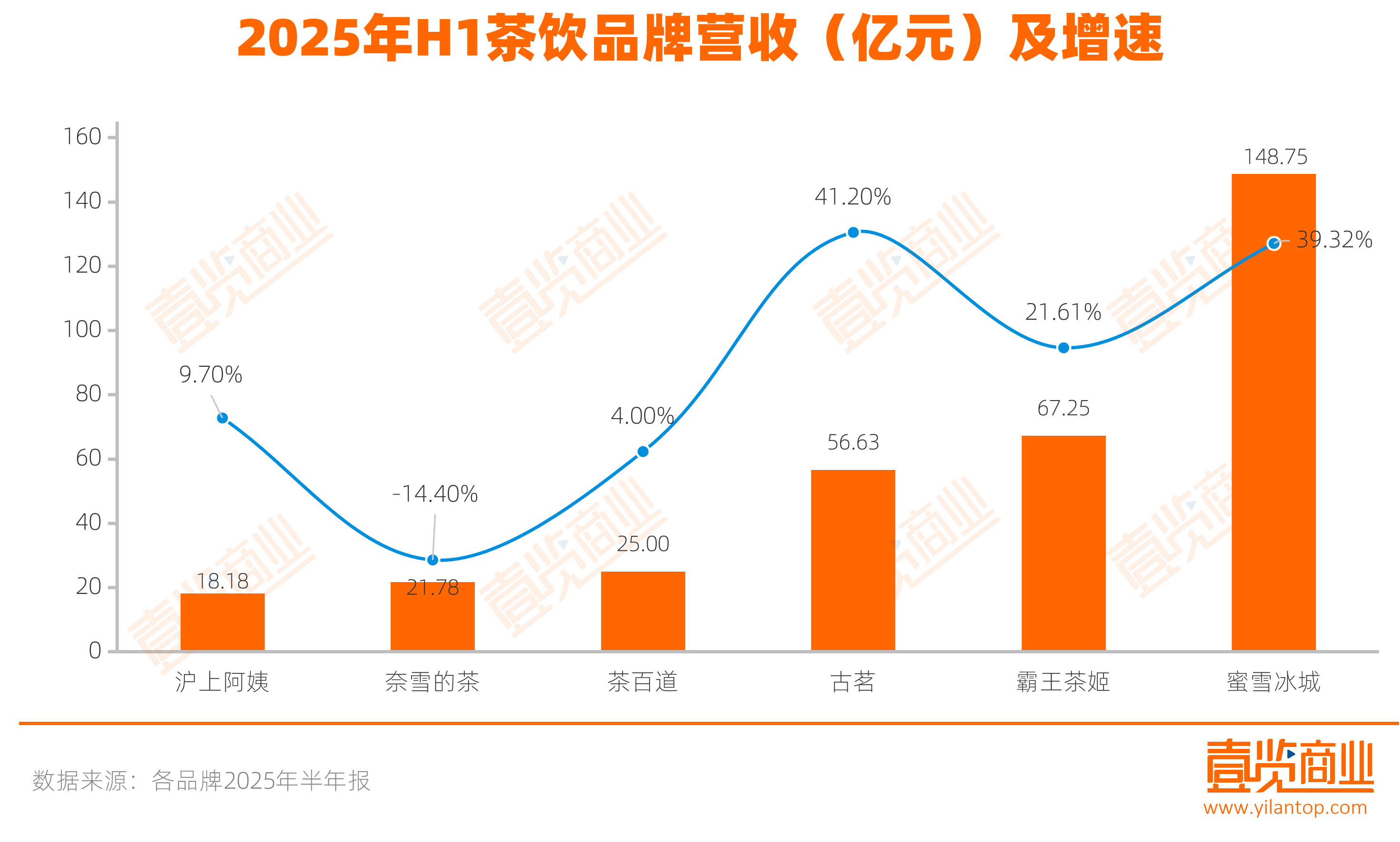 2025年上半年,6家上市茶饮品牌中,仅蜜雪冰城营业收入破百亿元,营收规模大幅领先,相当于霸王茶姬67.25亿元、古茗56.63亿元与茶百道25.00亿元的营收之和;在大基数下,蜜雪冰城营收增速39.32%,位于上市茶饮品牌的第二。