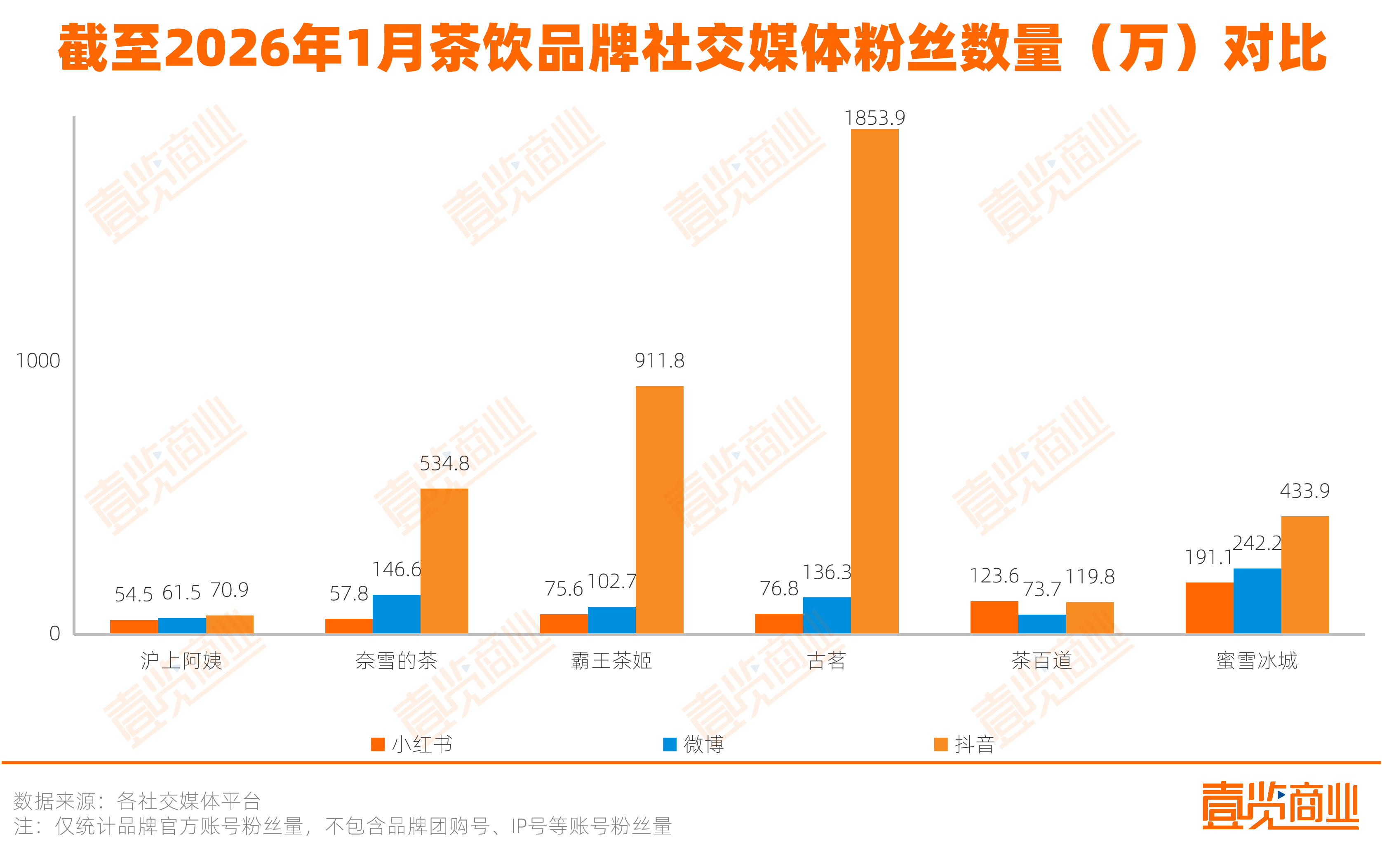 从社交媒体粉丝量看,蜜雪冰城同样表现突出。截至1月28日,在小红书,蜜雪冰城以191.1万的总粉丝量位居榜首,第二的茶百道123.6万粉丝,其余品牌粉丝量都在百万以内;在微博,蜜雪冰城以242.2万的粉丝量位居第一;在抖音,古茗以1853.9万粉丝断层领先,霸王茶姬的911.8 万和奈雪的茶以534.8万的粉丝量紧随其后,蜜雪冰城的433.9万粉丝量位居第四。