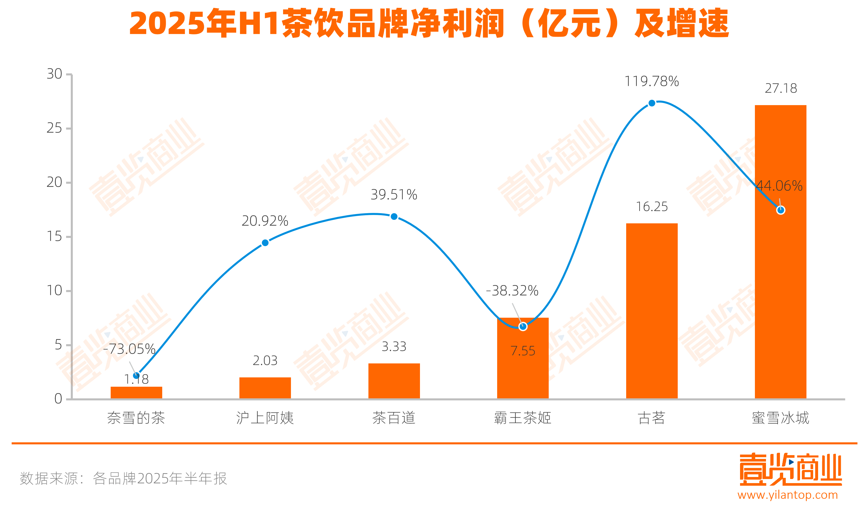 从净利润来看,同期蜜雪冰城以27.18亿元排在第一,44.06%的增速位居业内第二;古茗净利润为16.25亿元,增速最高,为119.78%。