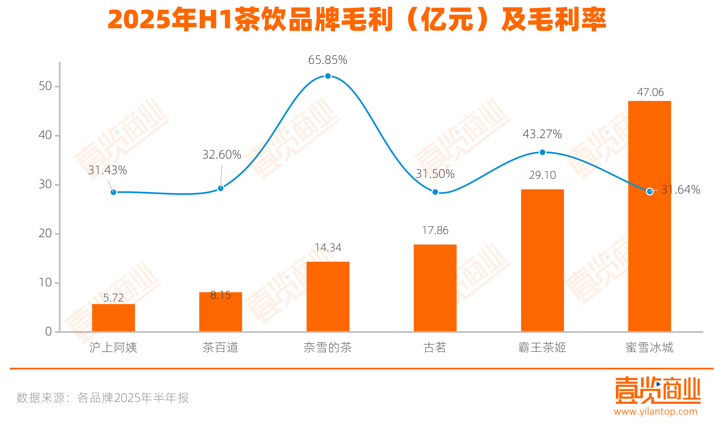 从毛利率看,据半年报,奈雪的茶凭借高客单价实现了高达65.85%的毛利率,霸王茶姬则以43.27%的毛利率位居第二,古茗、沪上阿姨、茶百道、蜜雪冰城的毛利率均在30%以上。