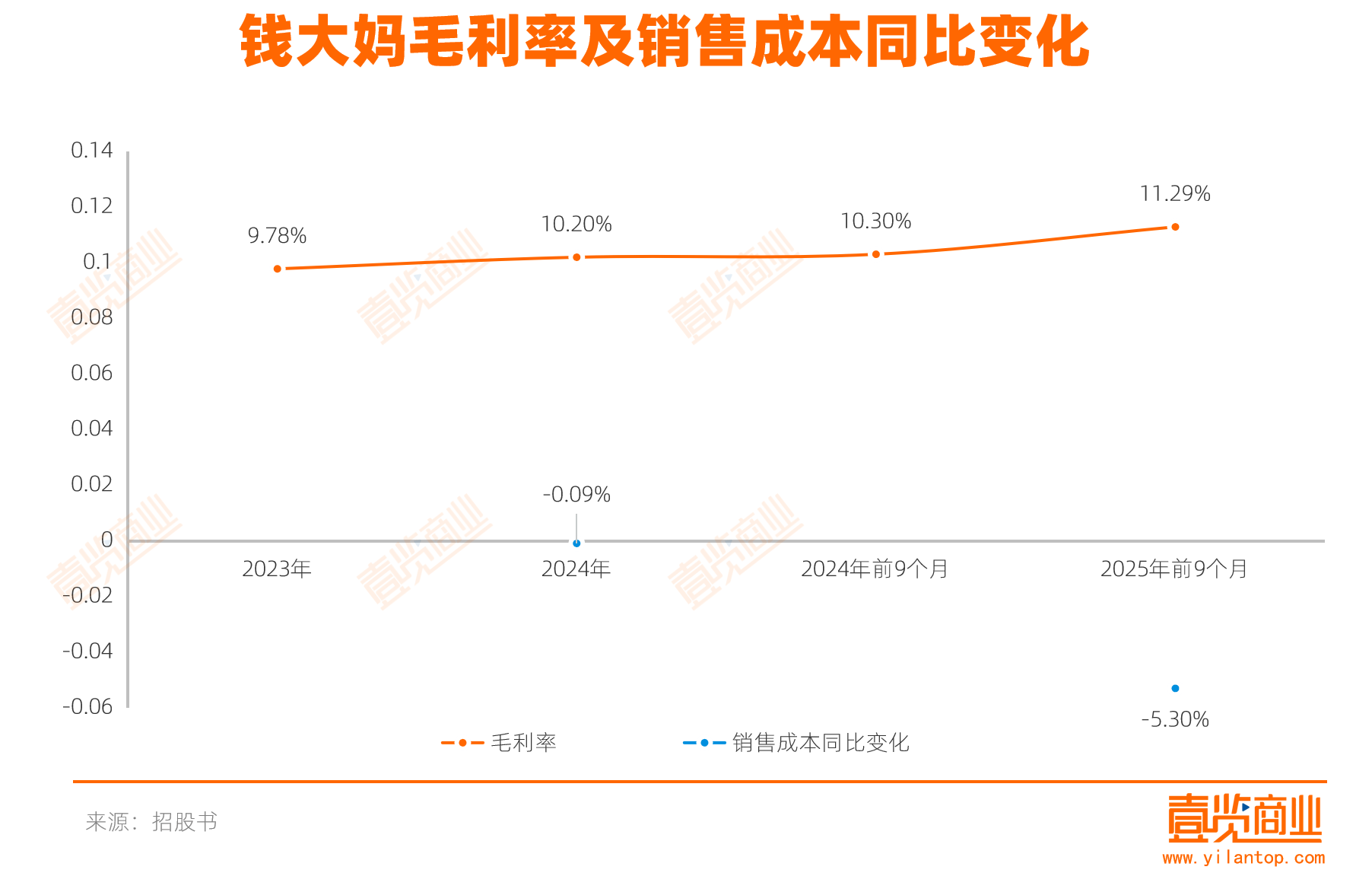 首先,成本结构大幅度优化。钱大妈毛利率从2023年的9.78%持续攀升至2025年前三季度的11.29%,直接得益于销售成本同比下降5.30%,且降幅大于营收降幅。