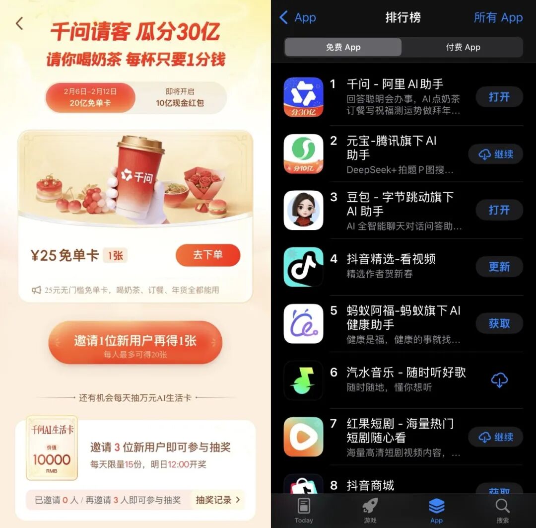 奶茶免单和社交裂变的效果可谓立竿见影,短短半天之内,千问就从App Store免费榜第六位直接冲到了第一位,成功超越霸榜五天的元宝。