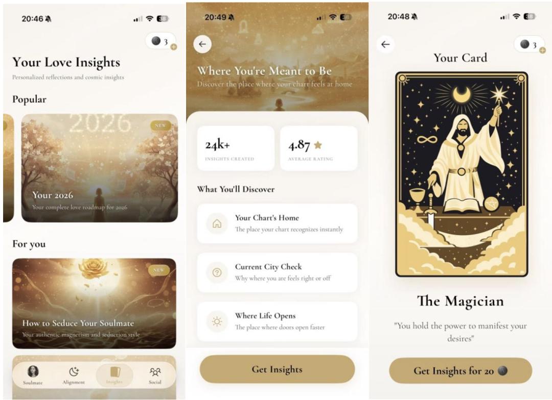 Insights 同样采用解读塔罗牌的方式,用户选择自己疑惑的问题,抽一张塔罗牌,并消耗对应银币后解锁内容。例如上方中图所示的就是一个与地理有关的内容,即是告诉用户当地的能量是否与他匹配,以及在哪个地方能更容易找到 Soulmate,而其他题目中还有“魅力测试、谁暗恋你、2026 年爱情路线图”等等,与亲密关系有关的内容。