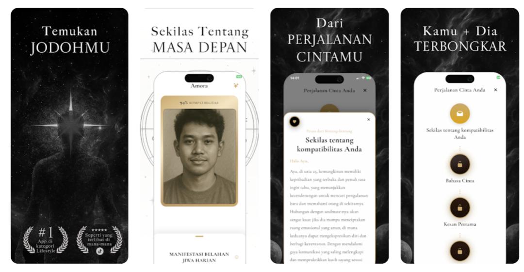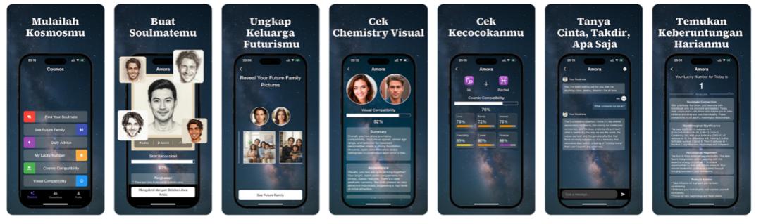 但扒了一圈社媒上关于 Amora 的内容发现,绝大多数社媒内容所呈现的 App 界面都是流水较高的「Amora: Belahan jiwa kamu」,语言基本是印尼语、越南语,也有少量西语和葡语内容,形式更像我们之前观察过的 Web 端占星产品 Hint,而非 Starla,核心目的是让用户相信,用 Amora 可以找到 Soulmate( 关于 Hint 可参阅之前的文章《借移动端的“凉梗”流量增长 150%,这家 AI 占星网站一年收入过千万》)。