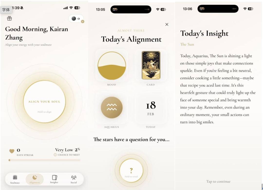 打开第 2 个标签 Alignment 是一个“每日签到”功能,用户需要按住中间圆圈,并持续几秒钟来“对齐灵魂”,通过仪式感,来增加用户的心理投入。而屏幕下方则会呈现连续打卡天数和遇见 Soulmate 几率两个数据,几率可以通过每日打卡提升,传递一个核心理念“你坚持得越久,越接近 Soulmate”。
