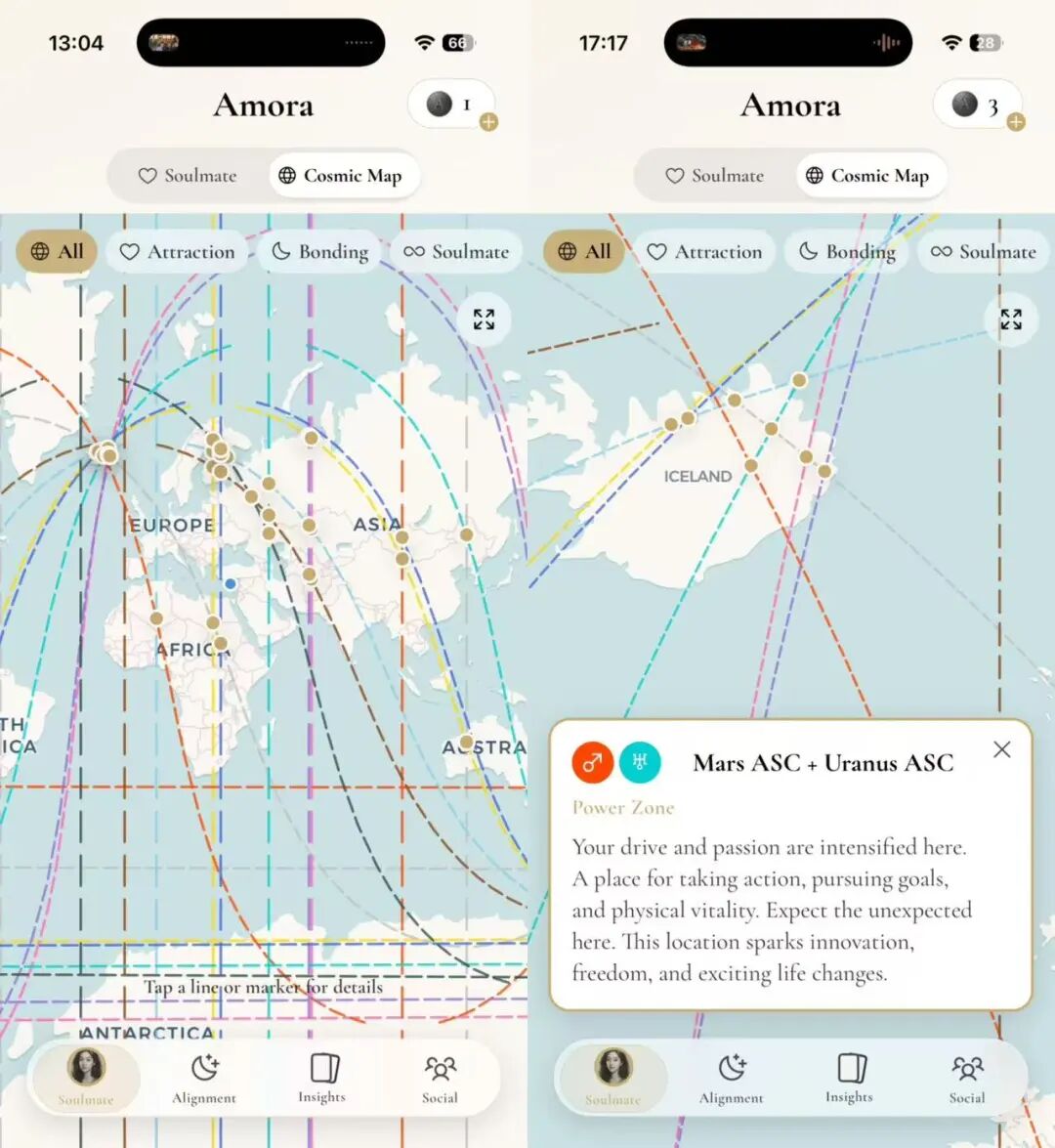 看到 Soulmate 的画像之后,下一个问题自然是去哪里找,而一级标签 Soulmate 下的二级标签 Cosmic Map 负责回答这个问题。依据占星地理学 (Astro cartography),app 为用户提供 Attraction(吸引)、Bonding(结合)、Soulmate(灵魂伴侣)、Luck(运气)等与亲密关系相关的能量线,而这些能量线的交汇点,则被定义为 Soulmate 可能出现地点,点击之后,弹出的卡片会为用户解读该地点能量场的变化、以及对寻找 Soulmate 的意义。