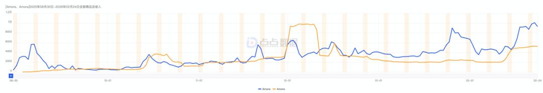 Amora: Belahan jiwa kamu(蓝色线)、Amora - Cari Belahan Jiwa(黄色线)近半年日流水数据|图片来源:点点数据