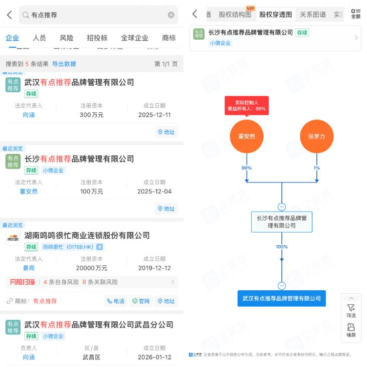 随后,壹览商业在企查查发现,「有.推荐」的主体公司为武汉有点推荐品牌管理有限公司,该公司由长沙有点推荐品牌管理有限公司全资持股。而长沙有点推荐品牌管理有限公司的实际控制人为霍安然,持股99%,张罗力持股1%。从明面上看,「有.推荐」与鸣鸣很忙确实并不存在股权联系。