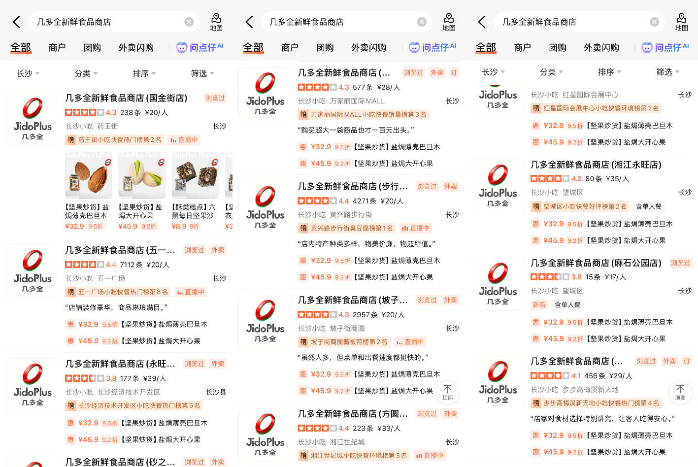 具体到门店运营层面,主要聚焦在SKU数量和选址布局上。新鲜零食店聚焦核心品类,SKU在300~1200区间;传统量贩零食店的SKU有1000~3000个。与量贩零食多开在大型社区周边、学校门口、县城主街不同,新鲜零食店更多开在当地的购物中心。以「几多全」为例,大众点评显示,其在长沙的20家门店,均分布在五一广场、吾悦广场、万家丽国际MALL等核心商业综合体,购物中心覆盖率达100%。