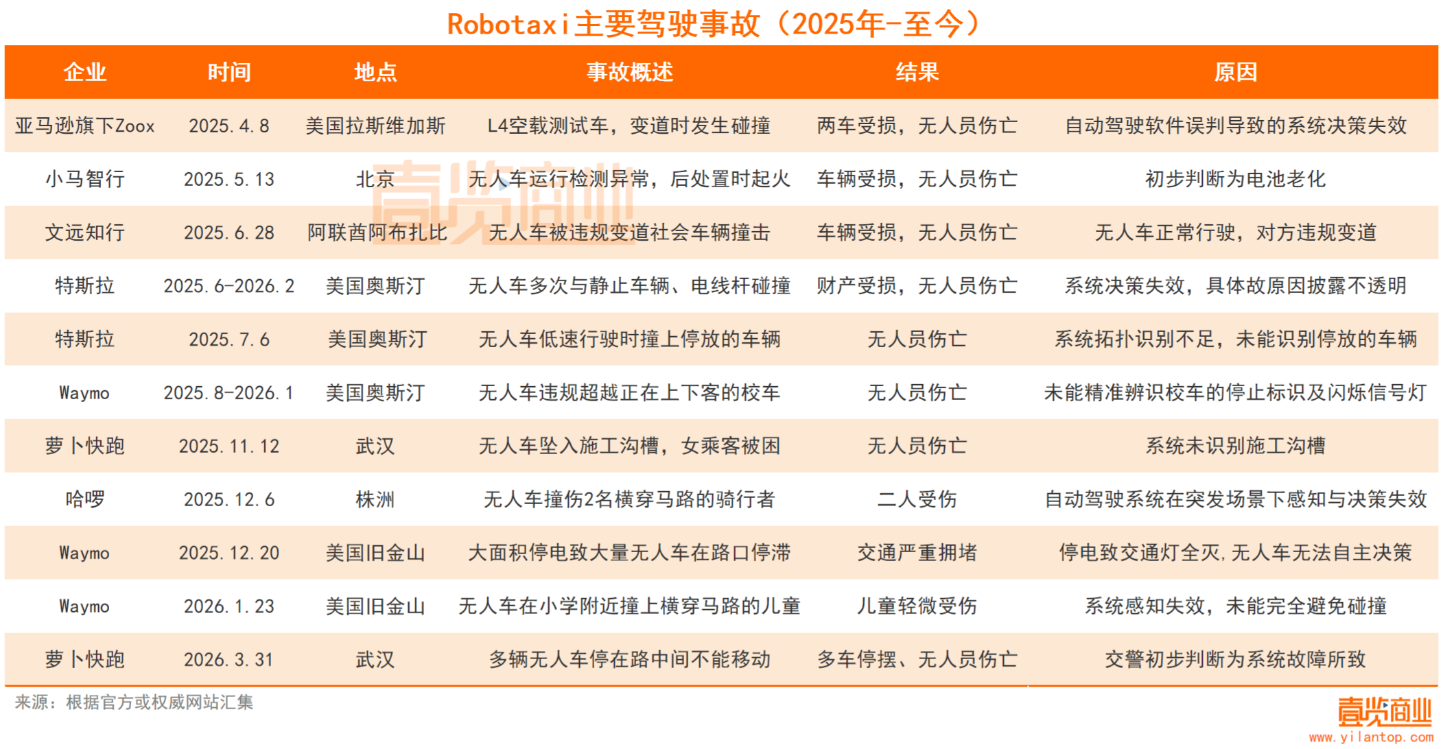 2025年以来,随着Robotaxi逐步进入规模化运营阶段,全球范围内不断发生引发广泛关注的Robotaxi事故,据壹览商业统计,事故涉及Waymo、小马智行等中美主流企业,无人车在不同城市的实际运行中,均不同程度暴露出各类安全与运行问题。