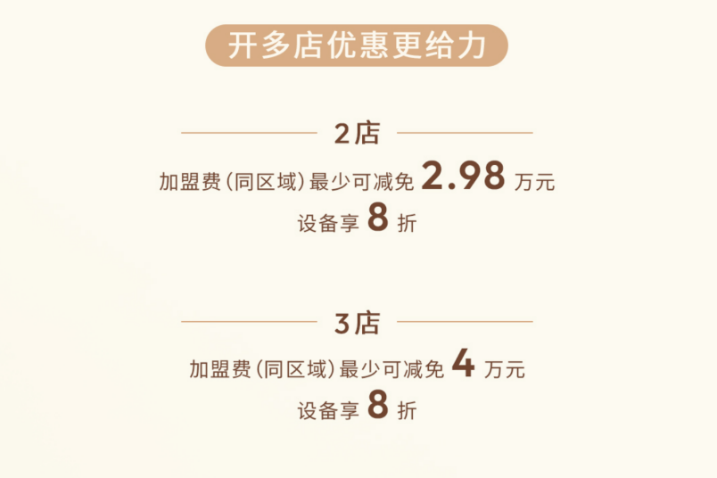但真正的看点在于后续的阶梯式扩店优惠政策。开设第二家店,加盟费最少减免2.98万元,设备享8折;开设第三家店,加盟费最少减免4万元,设备享8折。这一机制让已经验证过盈利能力的加盟商用更低的资金成本实现复制。