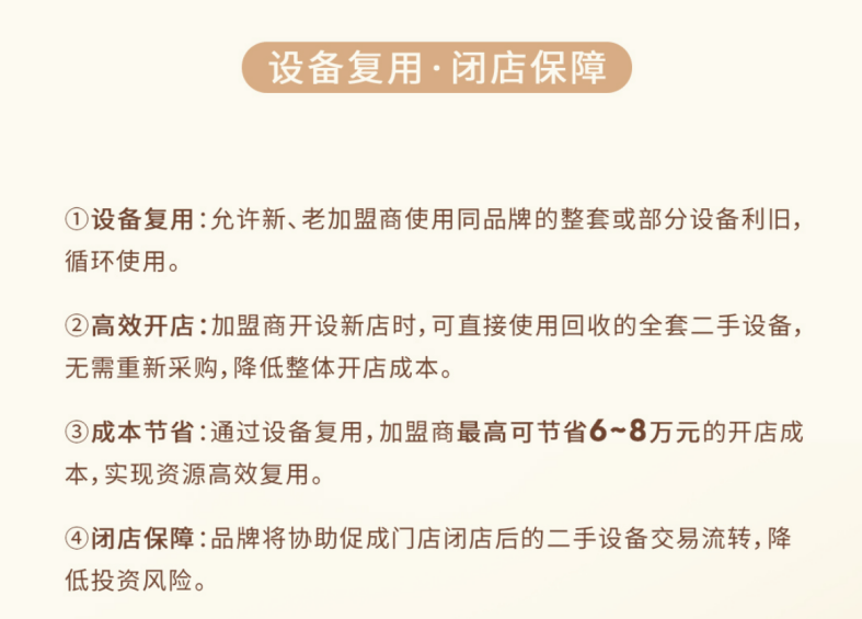 此外,爷爷不泡茶允许加盟商使用同品牌的二手设备,最高可节省6-8万元的开店成本,并承诺协助闭店后的设备流转,直接回应了“退出难”痛点。