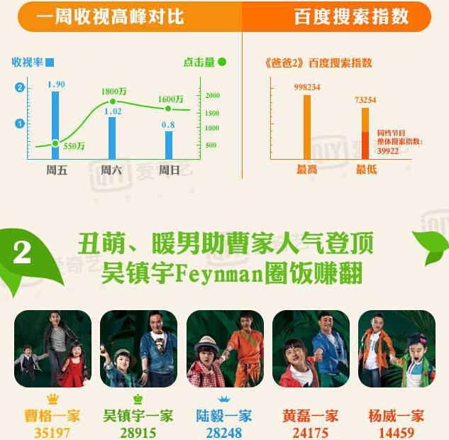 据爱奇艺数据显示,《爸爸2》在收视与流量方面形成高度互补,节目在周五播出时保持同时段最高收视率,独播视频网站爱奇艺助推其人气持续走高,综合热度保持稳中有进。